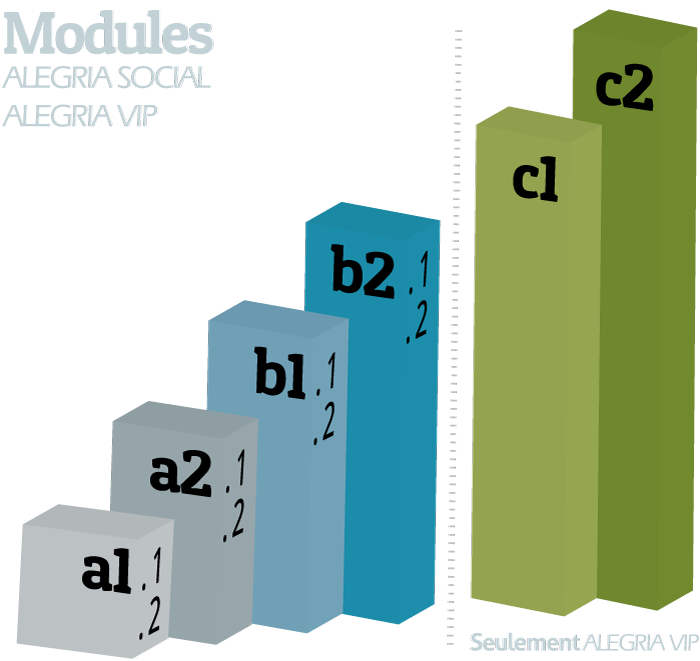 Abandon de l’élève : Si l’élève abandonne le cours au milieu d’un module, l’argent ne sera pas remboursé. Le coût des cours en groupes sont partagés entre les élèves. Donc, les élèves s’engagent avec ses collègues à aller jusqu’à la fin du module. Si vous avez besoin de plus de flexibilité, vous pouvez étudier avec les cours particuliers ALEGRIA VIP.